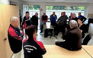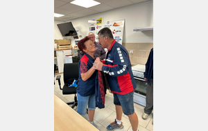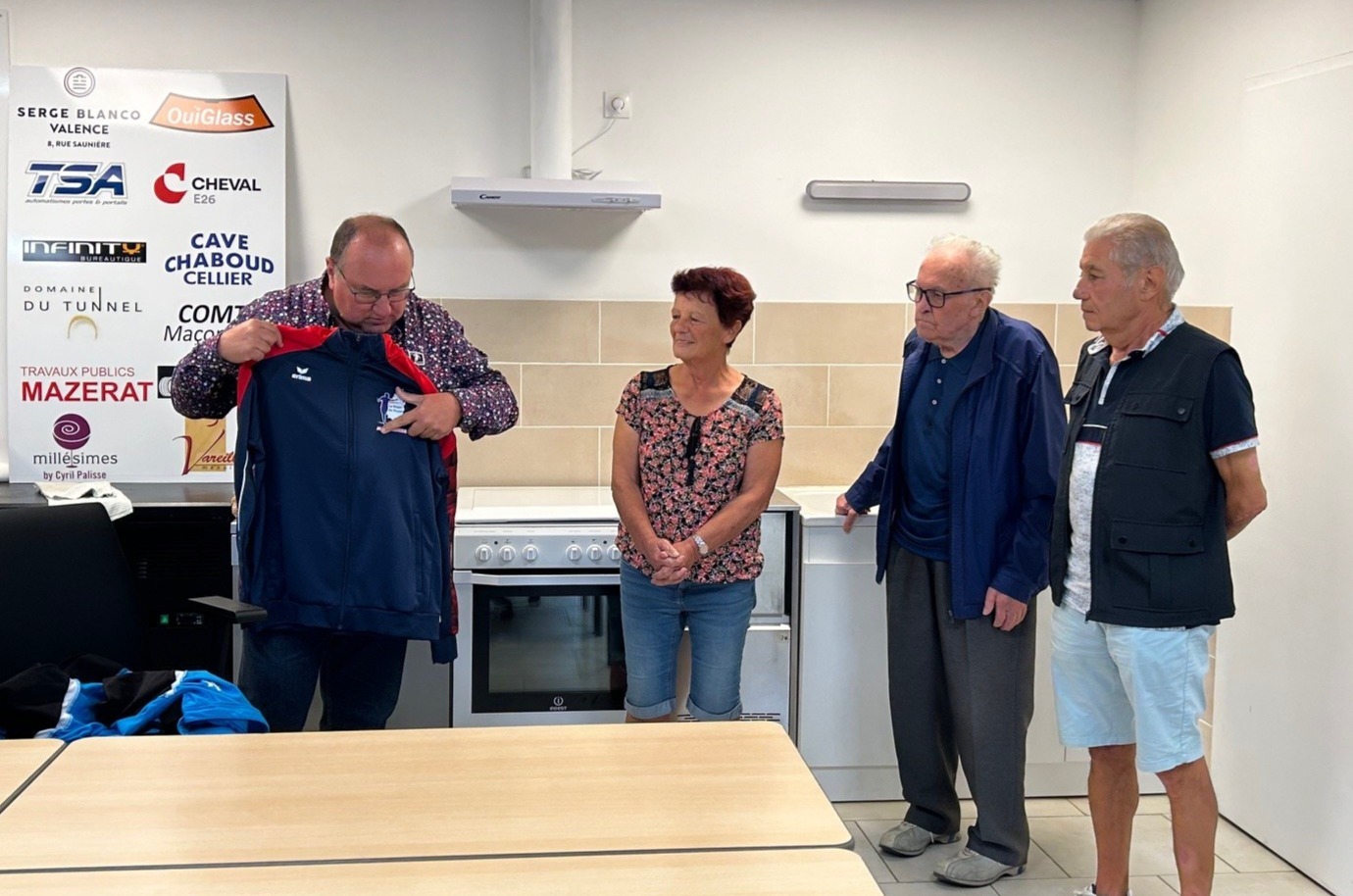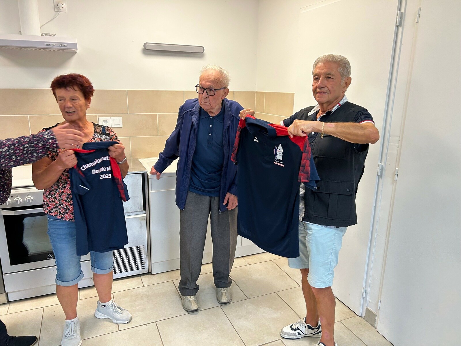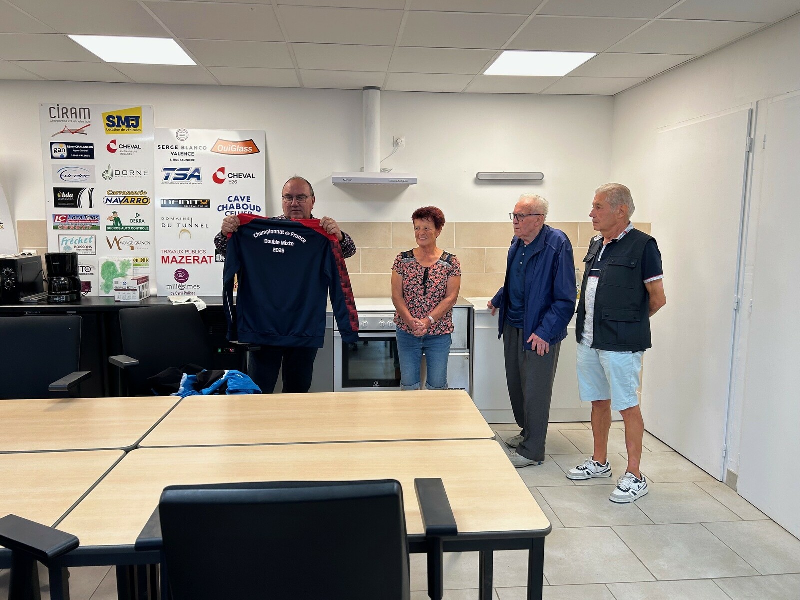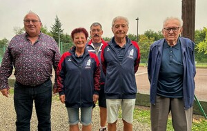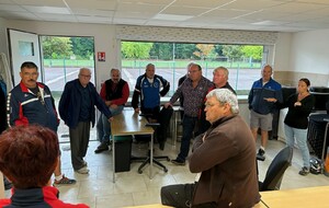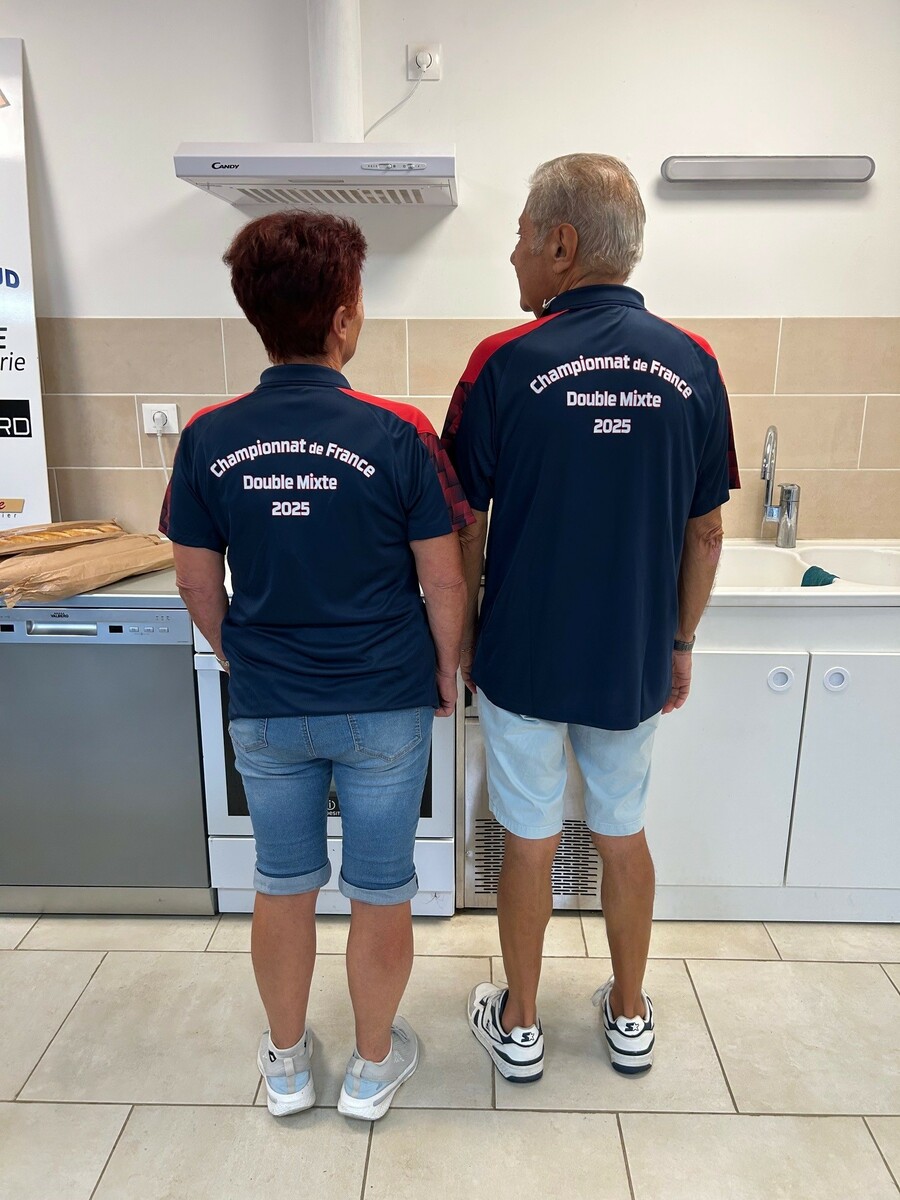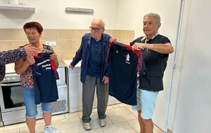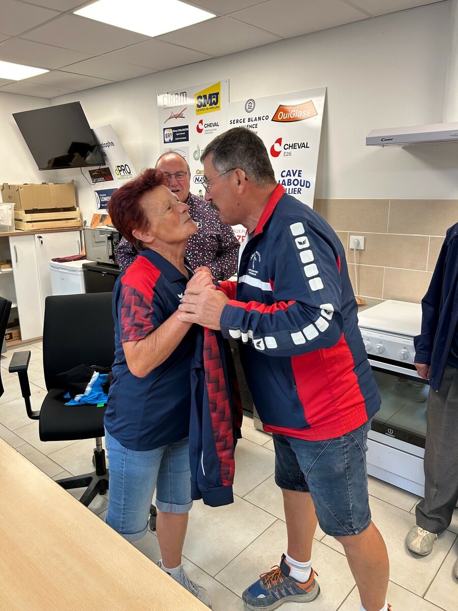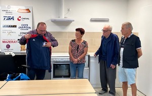 Jeudi 4 septembre, notre président d'honneur Jean Chirouze, notre président Jean-Luc CHANTEPY, les membres du bureau et quelques joueurs se sont réunis pour remettre à l'équipe Lucette ROUMEAS - Gérard JOUVE la tenue qu'il porteront à l'occasion de leur participation au championnat de France double mixte les 6 et 7 septembre à saint-Denis-Les-Bourg dans l'Ain. Rappelons que celle-ci a été faite spécialement par le club et offerte à nos deux joueurs pour cette compéttion.